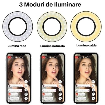 Suport flexibil pentru telefon cu 3 moduri de iluminare Ring Light