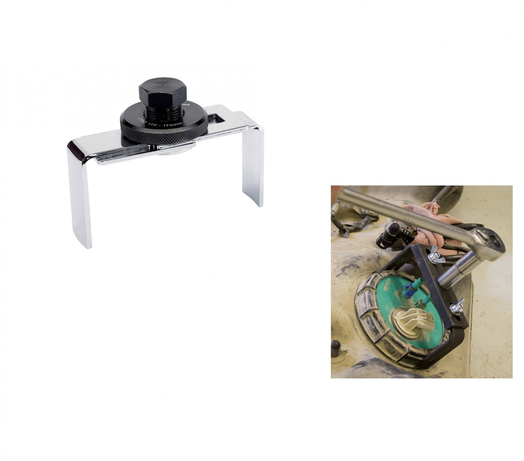 Presa universala cu 2 brate pentru demontarea capacului de la rezervoare se foloseste atat pentru demontarea cat si pentru montarea capacului superior de la rezervoare, dispozitiv indispensabil pentru schimbarea pompelor de benzina din rezervor sau plutitoarele de nivel al combustibilului.Aceasta presa universala se foloseste cu o cheie de 24 mm si are o dimensiune ajustabila de 80-122 mm