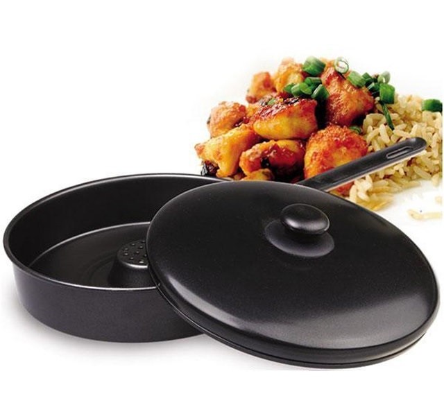 Tigaia speciala din teflon este folosita pentru gatitul sanatos si gustos! Aveti nevoie doar de un strop de ulei pentru a pregati delicioase fripturi iar legumele nu-si vor pierde culoarea si vitaminele. Spre deosebire de alte tigai, tigaia Magica are o calitate deosebita: centrul ei este ridicat si prevazut cu un orificiu. Prin acest orificiu, aerul patrunde in interior si coace mancarea. Alimentele nu se ard si nu se lipesc de tigaie. De asemenea, datorita sistemului unic de distribuire a caldurii, tigaia pastreaza proprietatile alimentelor. Gatiti rapid fripturi suculente si gustoase! Tigaia nu arde carnea, ca alte tigai sau gratare. Datorita capacului etans, carnea isi pastreaza suculenta, iar aerul cald ce patrunde prin orificiul special o fragezeste.Pentru ca friptura dvs. sa capete o crusta delicioasa, pastrandu-si fragezimea, adaugati un strop de ulei in tigaie, atunci cand preparati carnea. Bucurati-va de vitaminele legumelor! Cu Tigaia Magica Teflon preparati in cateva minute orice fel de legume. Pur si simplu, asezati legumele in tigaie (intregi sau cubulete), puneti capacul si asteptati. In doar cateva minute aveti o garnitura sanatoasa si delicioasa pentru friptura dvs. Tigaia Magica nu distruge vitaminele si proprietatile nutritive ale legumelor.Puteti gati carnea si legumele in acelasi timp. Datorita designului special, alimentele isi vor pastra gustul si proprietatile, iar dvs. injumatatiti timpul de preparare al unei mese copioase. Mancaruri de 5 stele datorita tigaii Magice ,aspectul preparatelor dumneavoastra pot rivaliza cu cele mai sofisticate aranjamente gastronomice. Cum este posibil acest lucru? Foarte simplu! Astfel, mancarea are un aspect proaspat si sanatos, iar culorile vii ale legumelor ii confera un aspect unic, delicios si elegant.