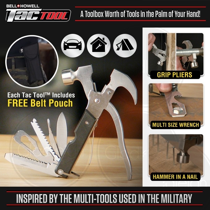 Instrumentul Tac este un dispozitiv inspirat din dispozitivele folosite de trupele speciale de elita ce inglobeaza 18 scule diferite intr-o singura unealta multifunctionala versatila de la taiere, inșurubare sau orice provocare indiferent de locul in care aveți nevoie.