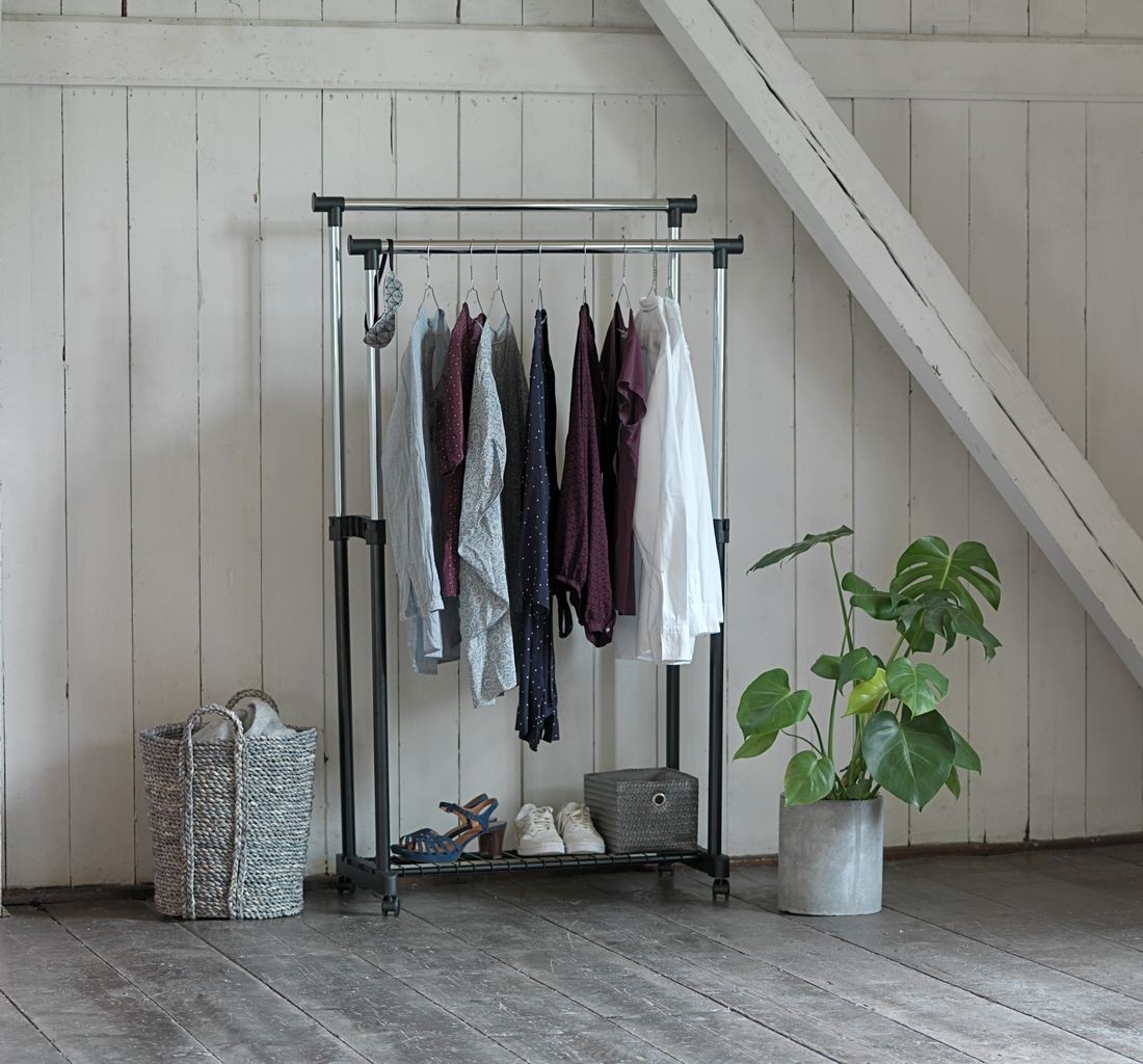 Suportul poate fi folosit in orice casa si birou, unde nu exista niciun loc pentru a stoca hainele. Produsul nostru a fost echipat cu o bara dubla cromata, a carei inaltime poate fi usor reglata cu cleme si roti pentru o mutare mai simpla.