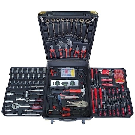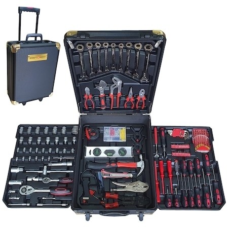 Totul este stocat intr-un troler robust cu roti si maner extensibil facilitand transportul acestei truse in orice locatie. Trusa de scule este organizata in patru compartimente speciale de inserare si contine o gama variata de scule, unelte si chei, de la surubelnite, imbusuri, chei fixe , clicket clesti, pistol silicon etc.