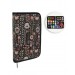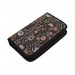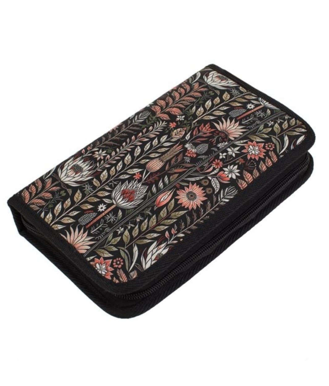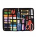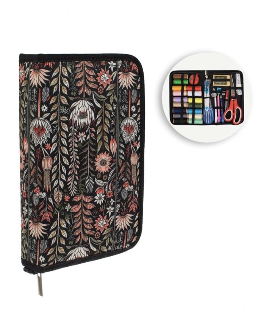Set de cusut cu bobine si diverse accesorii in husa floral cu fermoar negru.