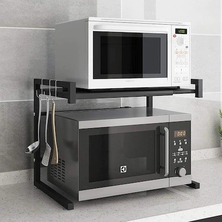 Raftul este creat cu doua niveluri, unul inferior pentru microunde si unul superior pentru depozitarea diverselor produse de bucatarie, cum ar fi ulei, condiment etc., si de ce nu obiecte decorative. Dispozitivul iti va permite sa pastrezi cu usurinta cuptorul cu microunde sau alte aparate de bucatarie, precum si diverse alte ustensile, mentinandu-ti bucataria curata si ordonata.