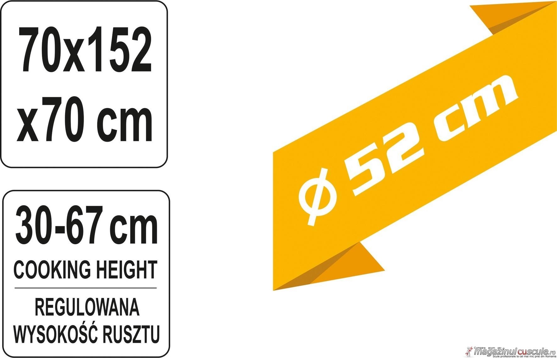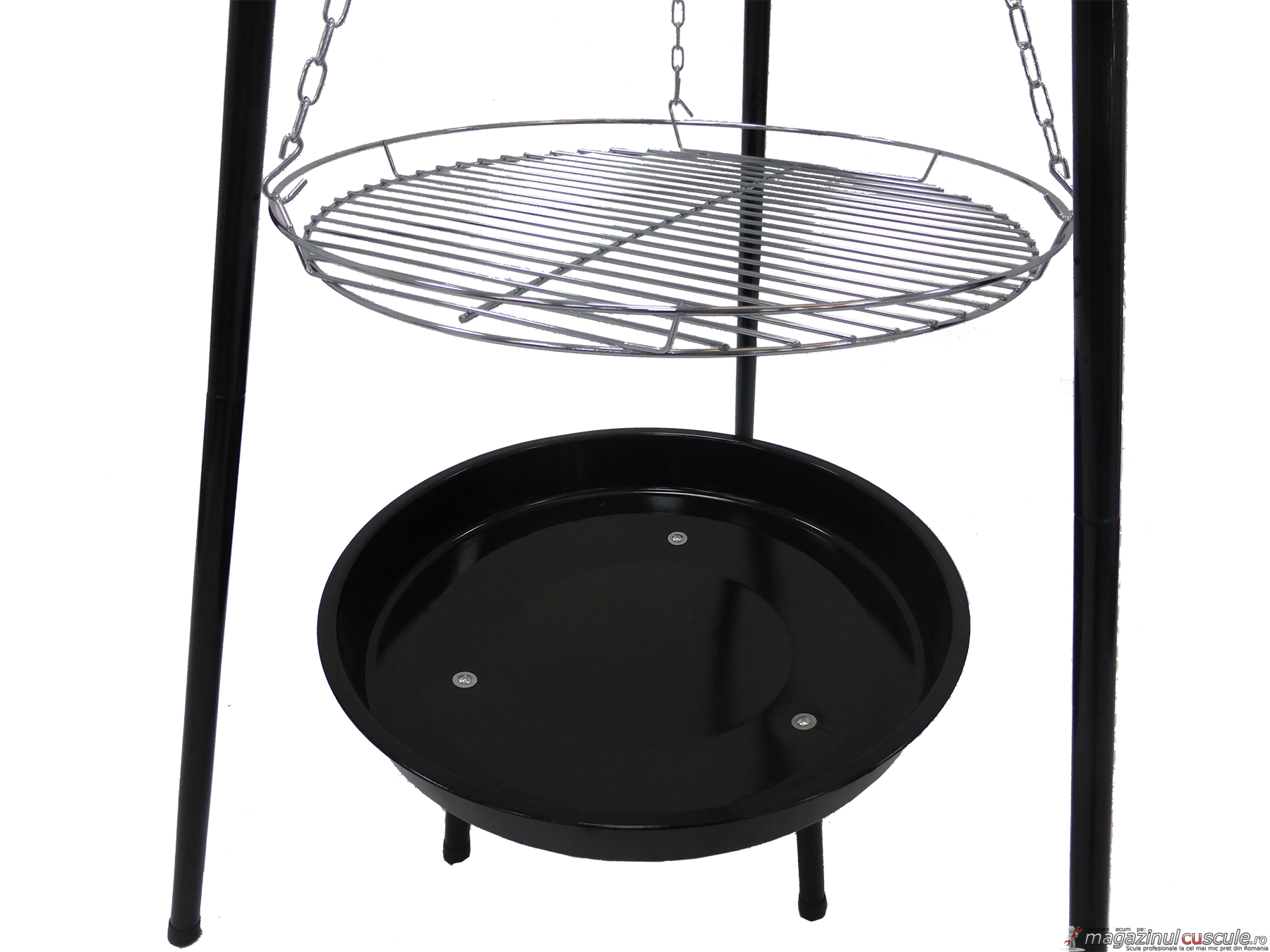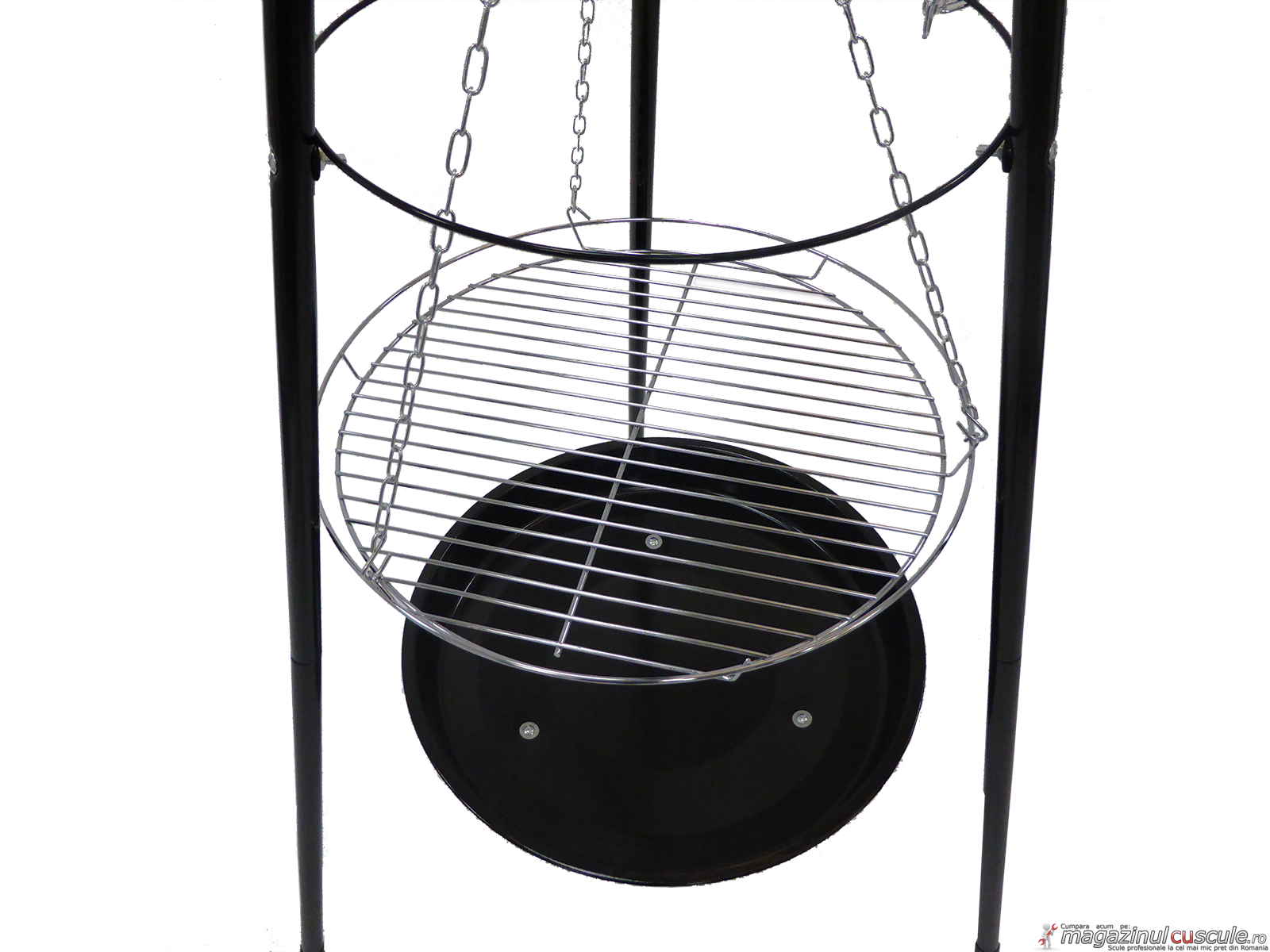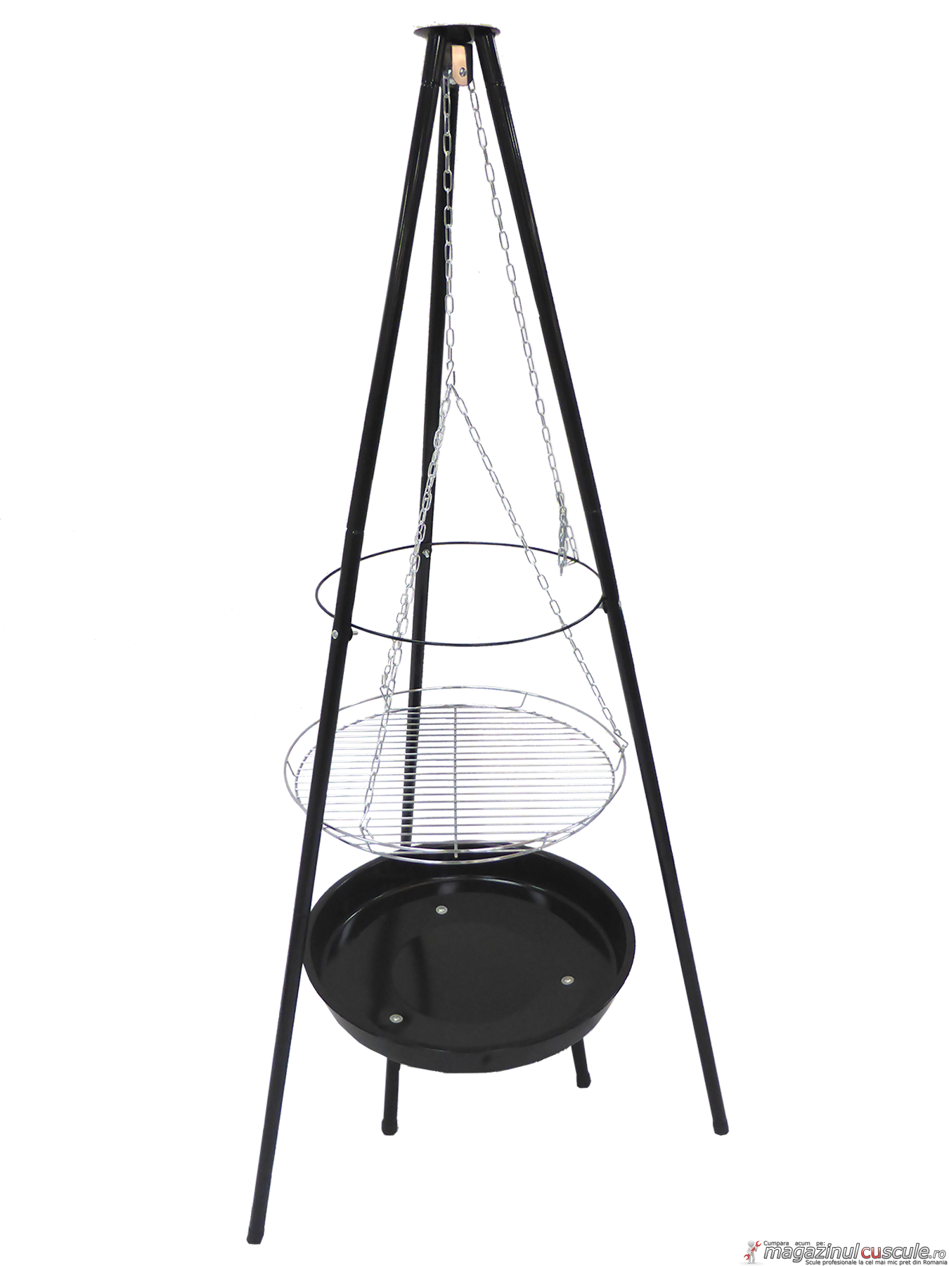 Gratar de gradina pentru un foc de tabara + vatra - agatat, din otel, acoperit cu vopsea rezistenta la caldura. Constructia trepiedului permite utilizarea unui gratar cu vatra, atasat la set sau deasupra focului. Grila cromata, inaltime reglabila cu lant.Dimensiuni: