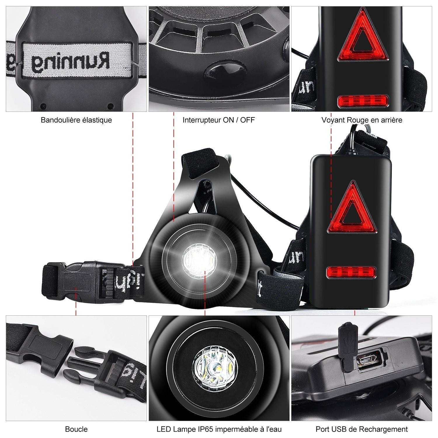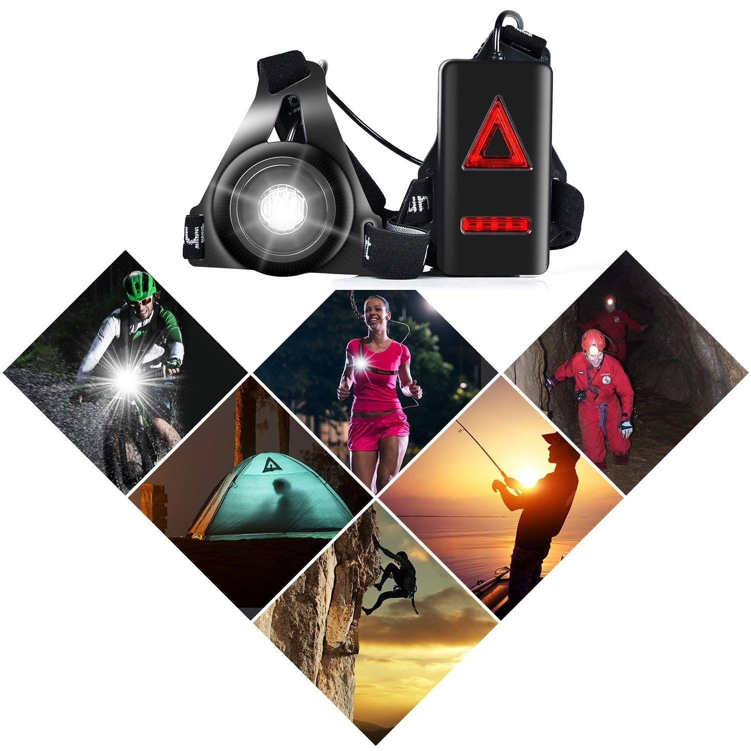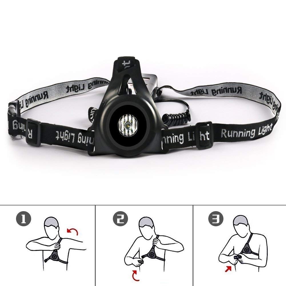 Lanterna pentru alergare Run Lights se poarta aplicata pe torace si dispune de acumulator incorporat, 3 moduri de iluminare frontala si avertizare luminoasa pentru spate.